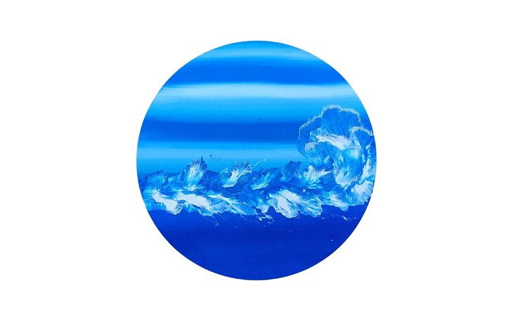 Das Werk „Waves in Motion“ aus dem Jahr 2022 abstrahiert eine sich brechende Welle vor einem blauen Himmel. Die strahlenden Blautöne des Bildes, sowie das Spiel mit Farbverläufen in den verschiedenen Techniken haben ein faszinierendes und einzigartiges Bild erschaffen. Einerseits hat es eine beinahe beruhigende Wirkung auf den Betrachter, andererseits ist alles in Bewegung und lässt die Gedanken auf eine Reise gehen..