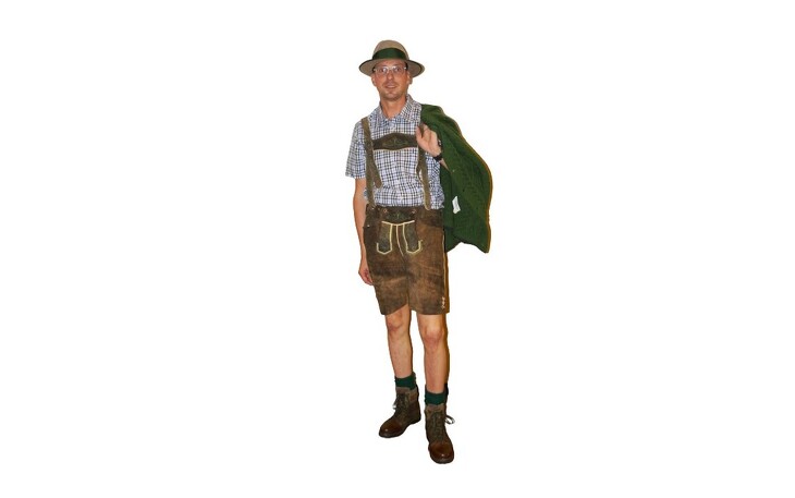Die kurze Lederhose besteht aus Rindsleder, die Schuhe sind Leder-Haferlschuhe, Hemd kann in den Farben rot, blau, grün frei ausgewählt werden.